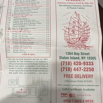 Latest reviews and ratings for Chinese Food at 420-440 Bay St in Staten Island - view the menu hours phone number address and map. Restaurant menu map for Island Garden located in 10305 Staten Island NY 1372 Bay St. Staten Islands Chinese restaurant and menu guide.